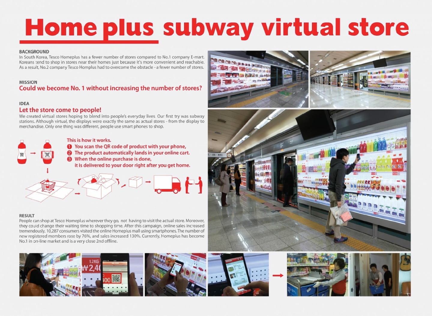 Through this campaign, 10,287 consumers visited the online Tesco (Homeplus) mall using their smartphones. The number of new registered members increased by 76%, and on-line sales climbed 130%.